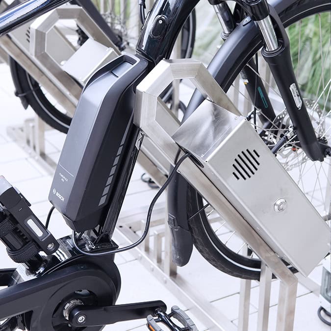 Wahlweise erfolgt die Einstellung klassisch von vorne, im 45 Grad-Versatz (schräg) oder beidseitig. Zusätzlich besteht die Möglichkeit eine abschließbare Ablagebox für die sichere Verwahrung von Ladegeräten (E-Bike) am Anlehnbügel zu befestigen.