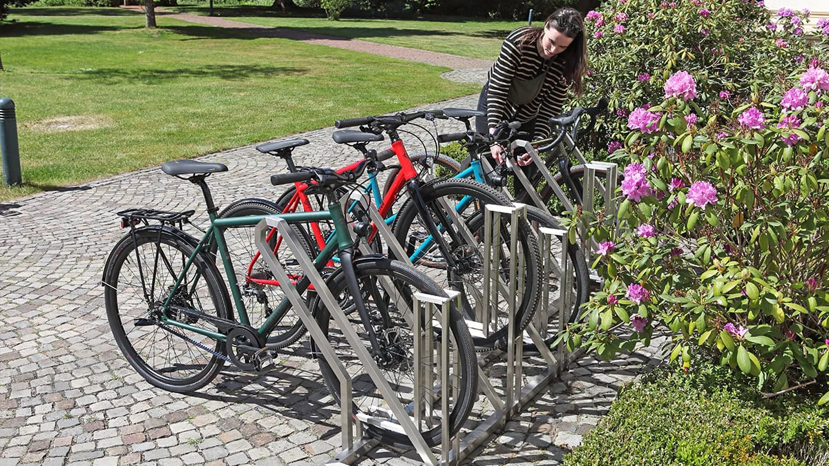 cervas ist ein Fahrrad-Reihenständer aus 100 % Edelstahl mit fixen Einstellplätzen im praktischen Hoch-Tief-Versatz, damit sich die Fahrradlenker nicht in die Quere kommen. Gleichzeitig werden die Fahrräder gegen das Umkippen und Umknicken geschützt. Eine felgenschonende Abstellung